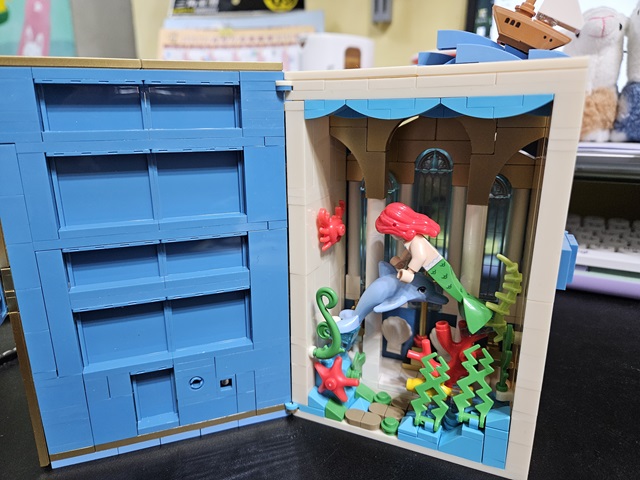 背面是海底宮殿,這裡有個缺點,宮殿透明窗頂端是沒有固定的,所以在拿故事書時常常會把拱型窗往內壓,很危險的...先看側邊,打開是王子......的銅像?????? 上層是兩箱寶藏,蓋子可以打開,裡面是放了一些亮晶晶的東西。然後流落在外的是長出腳的愛麗兒,書中沒有她的立足之地,最後只好直接把她扔進書裡,以免不見
